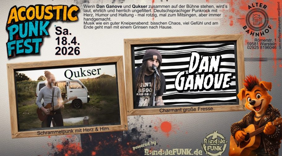 Wenn Dan Ganove und Qukser die Bühne teilen, gibt’s ehrlichen deutschsprachigen Punkrock: roh, melodisch, mitsingbar und garantiert nicht geschniegelt.